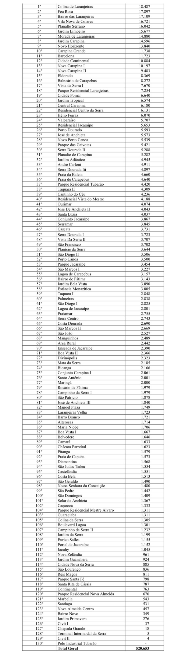 Ranking do IBGE: Colina de Laranjeiras lidera como o bairro mais populoso da Serra – confira a lista completa